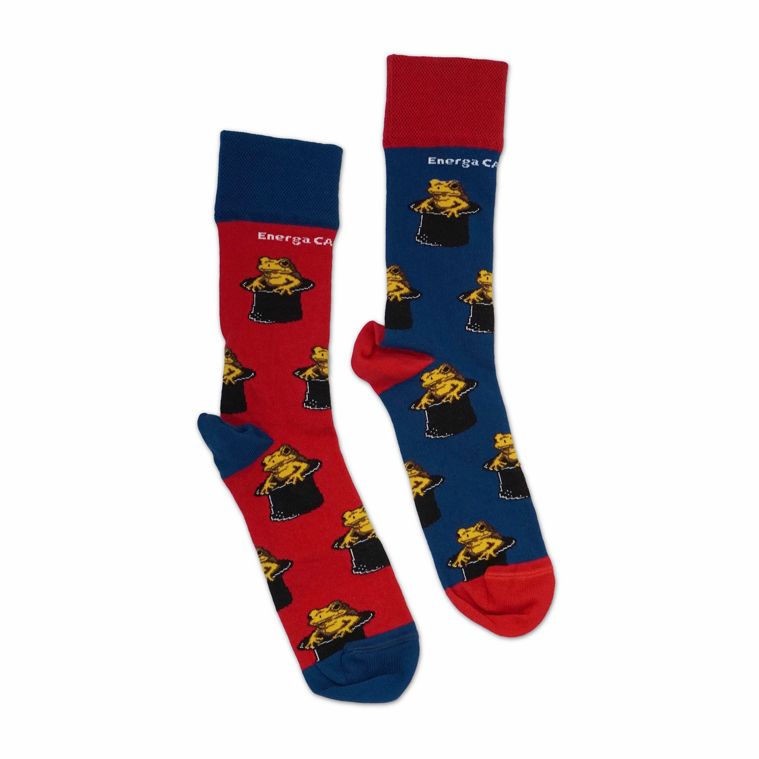 Wysokogatunkowe skarpety Many Mornings z fragmentami plakatu 33. edycji festiwalu EnergaCAMERIMAGE z 2025 roku – żaba wychodząca z magicznego kapelusza. Na obu skarpetkach napis EnergaCAMERIMAGE. Kolory odpowiadające koncepcji plakatu: czerwień, turkus. Skład: 80% bawełna, 15% poliamid, 3% elastan, 2% inne włókna.